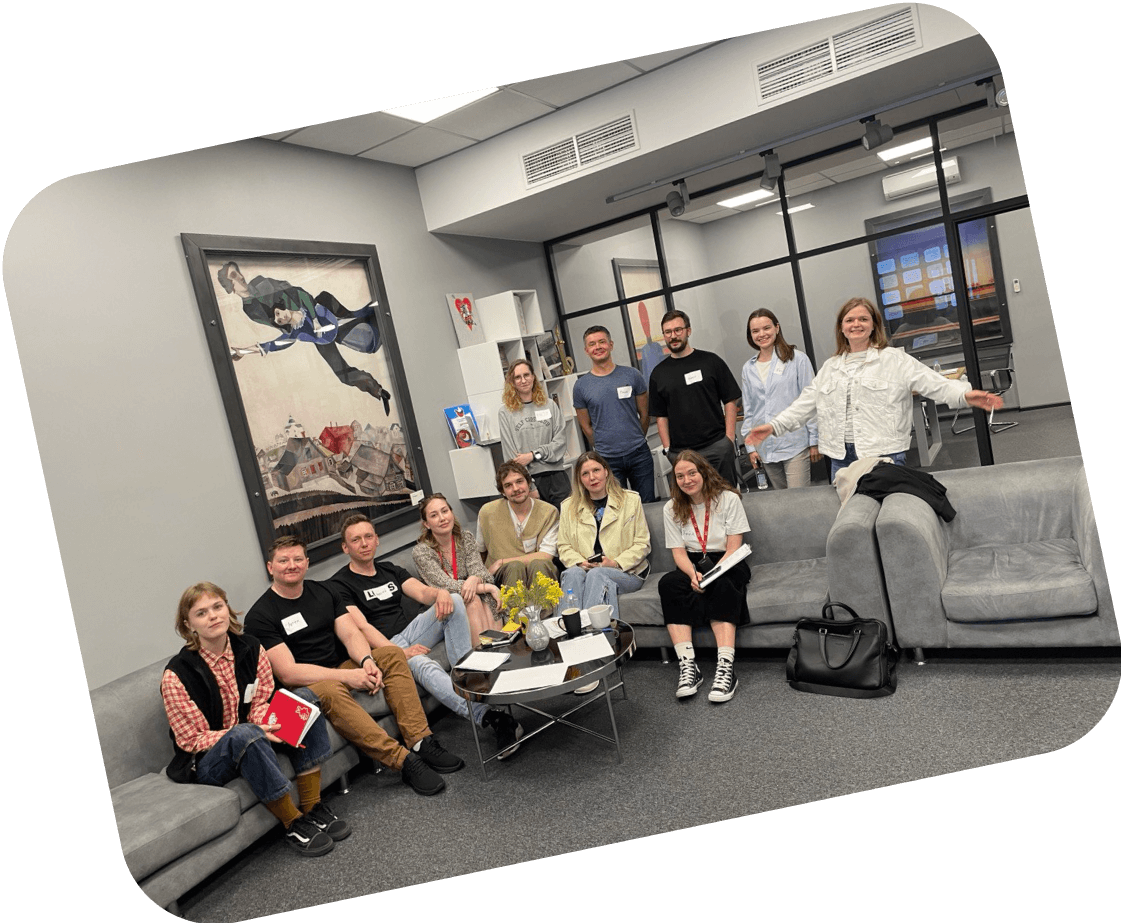 Каждый из нас работает над своими продуктами, и все вместе мы развиваемся как единая дизайн-команда со своими ритуалами и большими общими задачами. Постоянно делимся опытом друг с другом, ходим на лекции и сотрудничаем с лидерами российского дизайна — компанией «Ценципер», студией Charmer, агентством Red Keds, БВШД и Bang Bang Education.